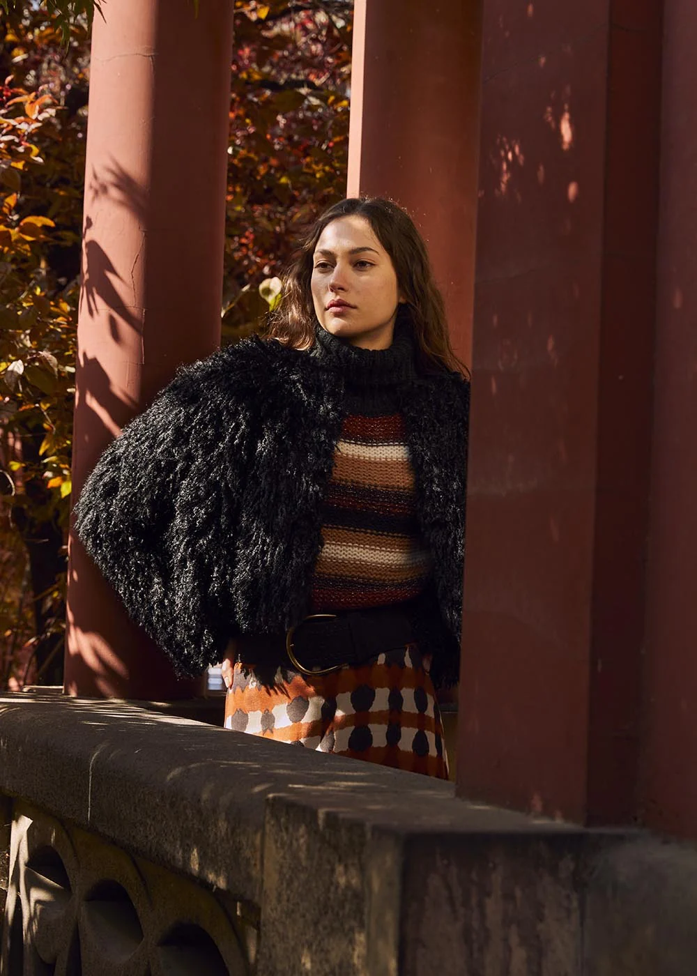 Ce look automnal joue sur les textures et les motifs rétro. La personne porte un pull à rayures tricoté dans des tons chauds (orange, beige, marron) associé à une jupe aux motifs géométriques assortis. Par-dessus, une veste noire en fausse fourrure apporte de la structure et du contraste, tout en restant dans une esthétique vintage chic. La large ceinture noire à boucle dorée ajoute une touche moderne, définissant la silhouette. L’ensemble est parfait pour un style rétro mais sophistiqué, avec une palette automnale chaleureuse et des textures douillettes.